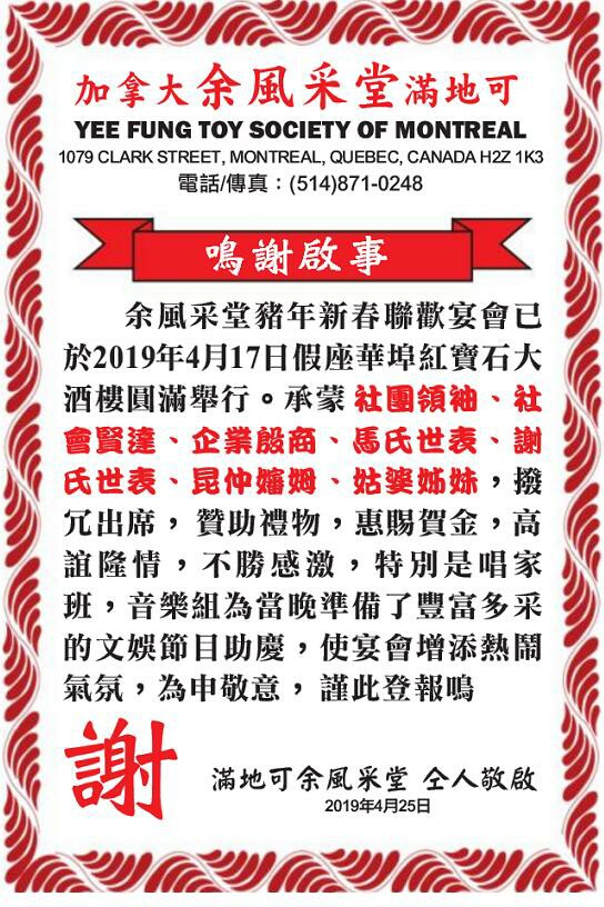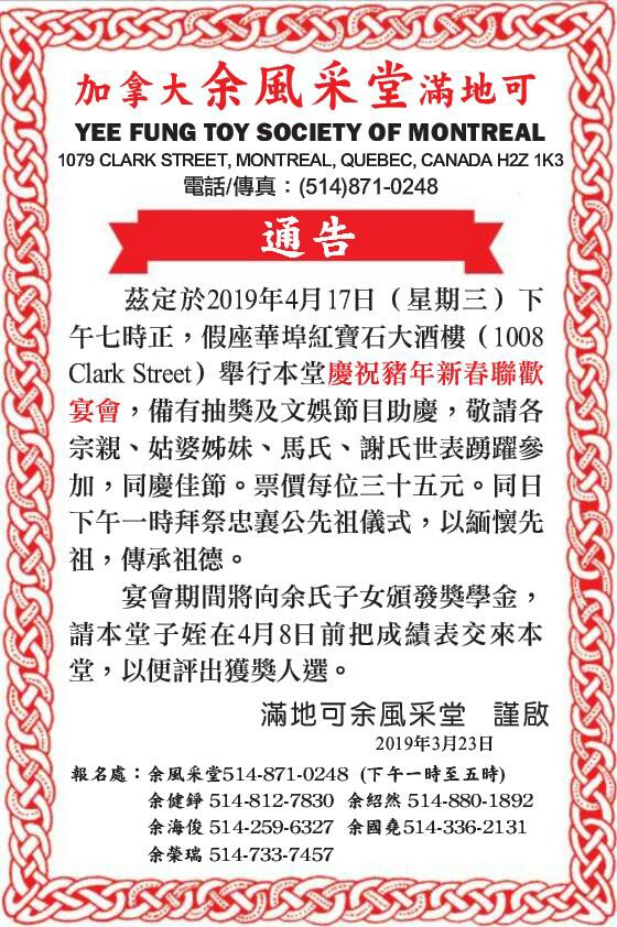 The Yee Fung Toy Society of Montreal滿地可余風采堂 二零一九年活動 (2019 Activities)