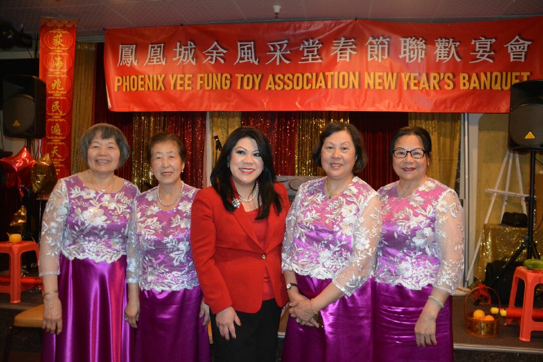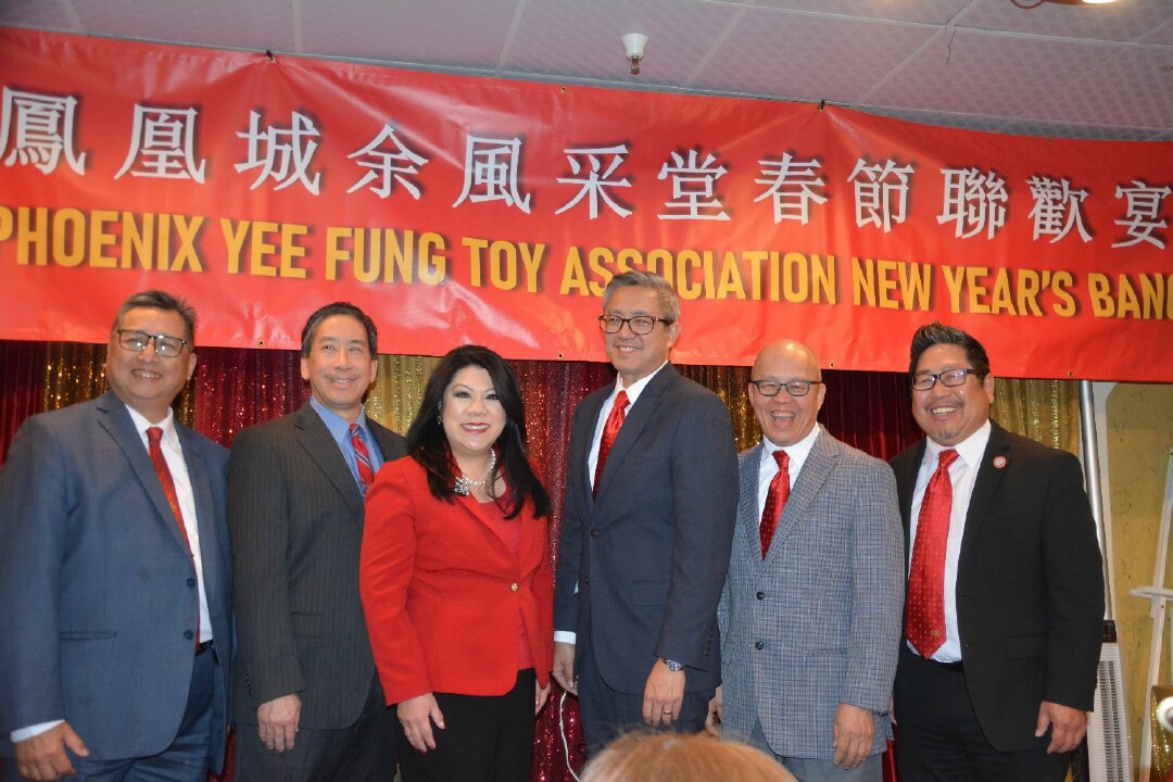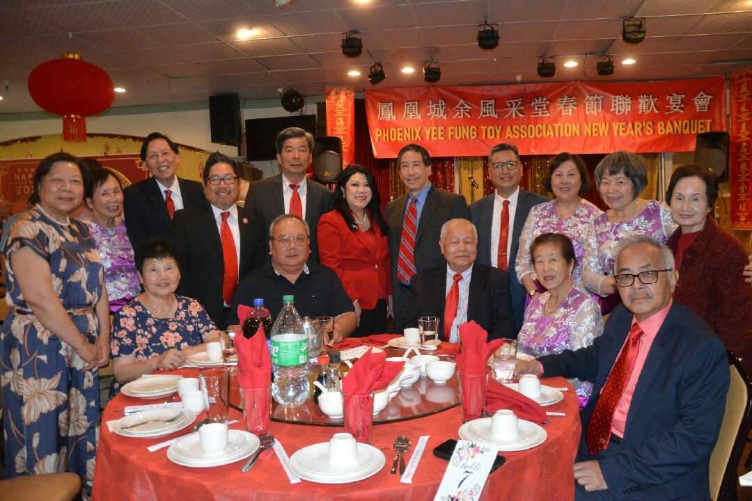 晚間春宴移師六福大酒家舉行,席開三十三桌。各僑團領袖、社會賢達、宗親好友扶老攜幼,共聚一堂。