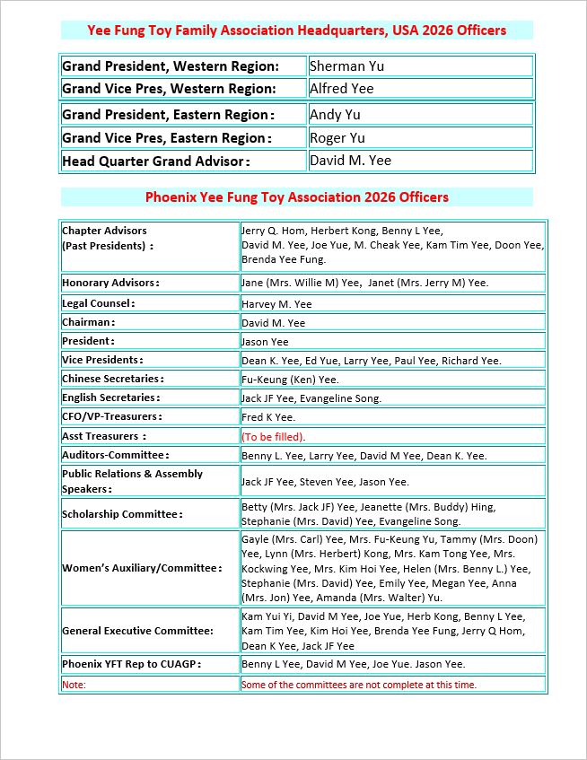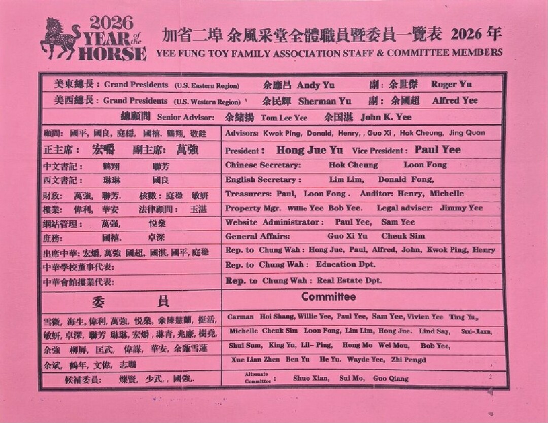 加州二埠余風采堂二零二六年度新屆職員名單如下: